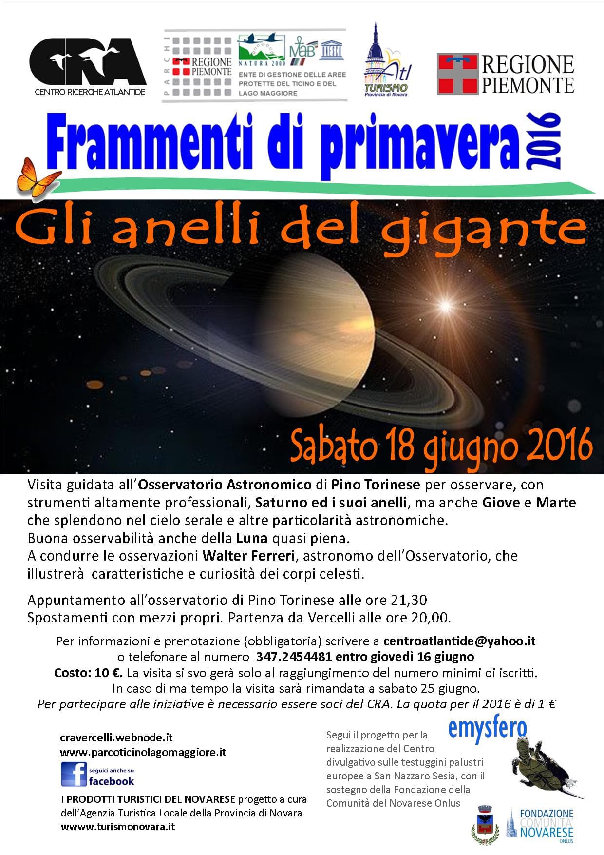 Grazie al CRA Centro Ricerche Atlantide in collaborazione con l’Ente di Gestione delle aree protette del Ticino e del Lago Maggiore, sabato 18 giugno si terrà l’ultimo appuntamento di “Frammenti di primavera 2016” che prevede la visita all'osservatorio astronomico di Pino Torinese.