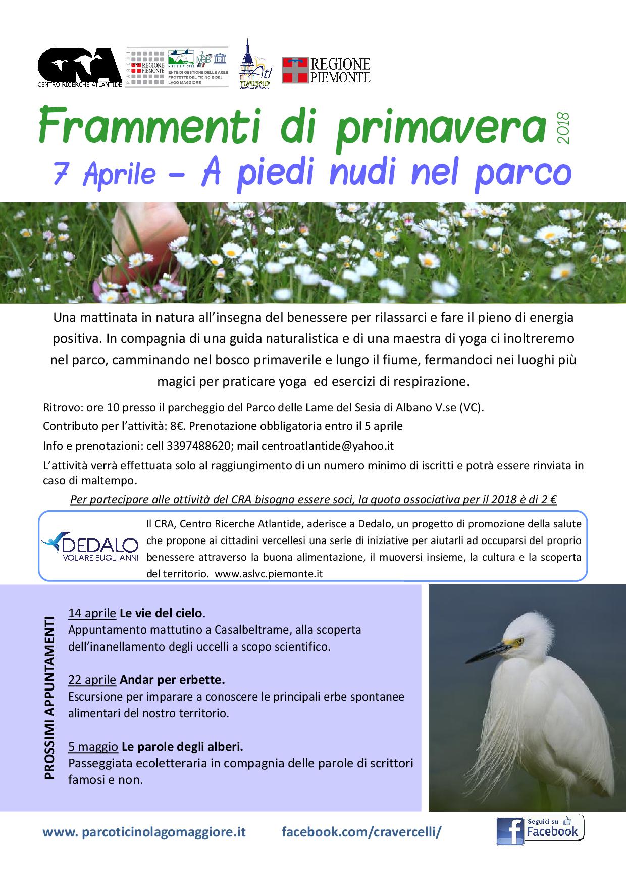 Secondo appuntamento, ancora dedicato alla salute e all’esercizio fisico all’aria aperta, per Frammenti di primavera, il ciclo di eventi organizzati dal Centro Ricerche Atlantide in collaborazione con l’Ente di gestione delle aree protette del Ticino e del lago Maggiore.