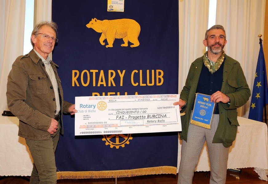 A dare il via alla raccolta fondi promossa dal FAI Biella è arrivata nei giorni scorsi la splendida notizia di una cospicua donazione da parte del Rotary Club Biella: l’associazione, nel solco della propria attività benefica a favore del territorio, ha voluto fare dono al FAI di Biella della somma di 500 euro. È stato il presidente Andrea Franciosi a consegnare l’assegno al capo Delegazione FAI Biella Davide Furfaro: “Il Rotary Club Biella è molto felice di poter partecipare a questa iniziativa – dice Franciosi - e come dice il format, la Burcina è proprio nei Cuori di tutti i Biellesi che ne hanno percorso i viali in ogni stagione dell’anno provando di volta in volta emozioni diverse ed intense potendo godere di questo spettacolo della natura”.