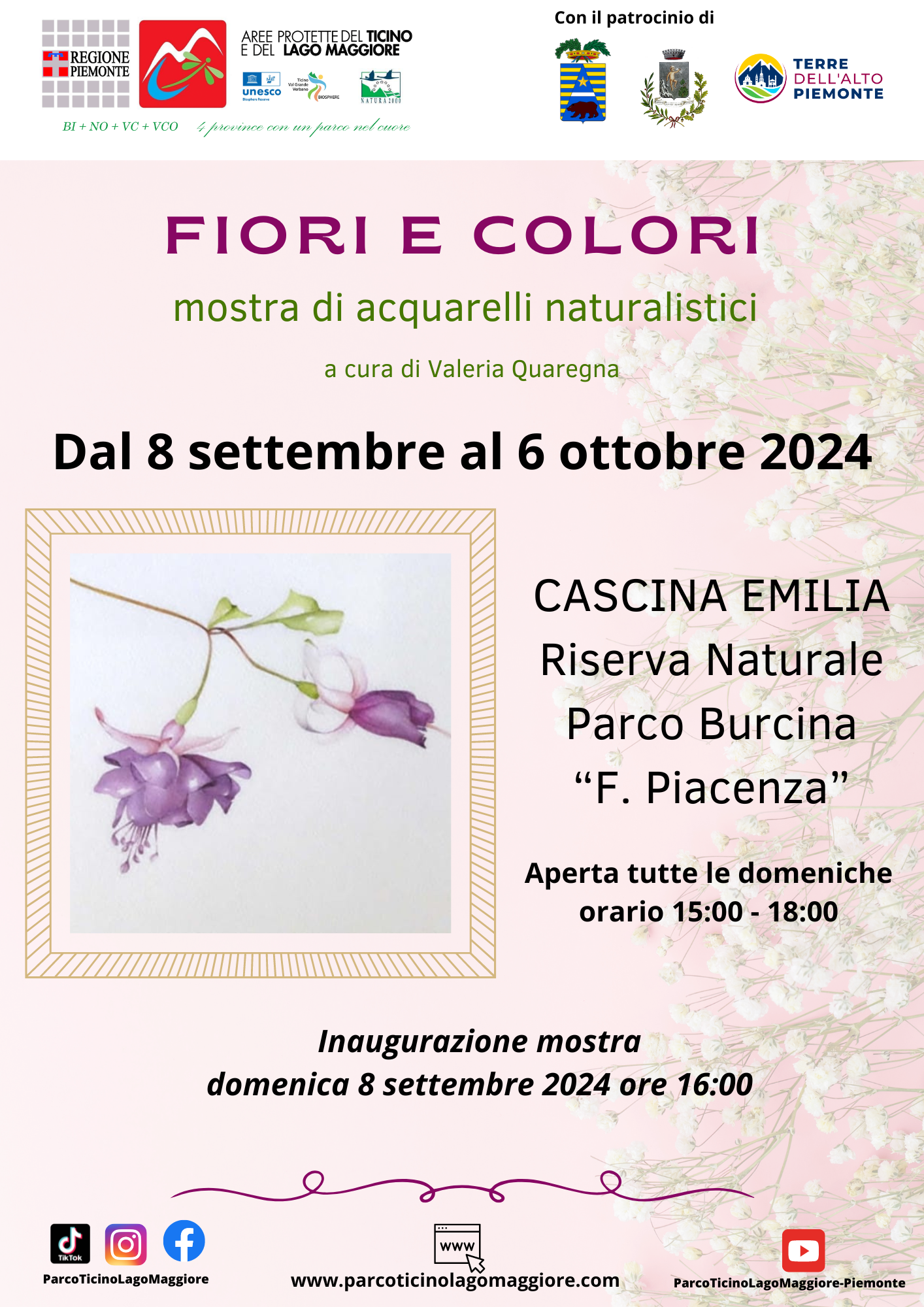 - 8 settembre ore 16:00 a Cascina Emilia inaugurazione della mostra “Fiori e colori – acquarelli naturalistici” che resterà aperta tutte le domeniche fino al 6 ottobre con orario 15/18.