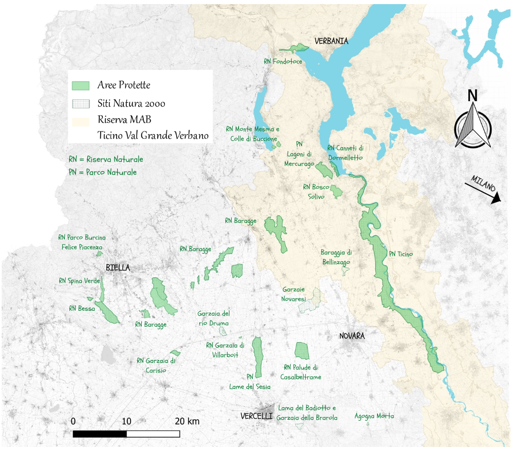 - Lungo le rive del torrente Elvo nel comune di Carisio, un’area costituita da boschi naturali ricostruiti con essenze autoctone frammisti a robinieti e boschi golenali con ridotti coltivi costituiti da risaie, si sviluppa la riserva naturale della “garzaia di Carisio”. Nel vercellese è presente anche la ZSC/ZPS “IT 1120014” Garzaia del rio Druma gestita dall’ente Parco.