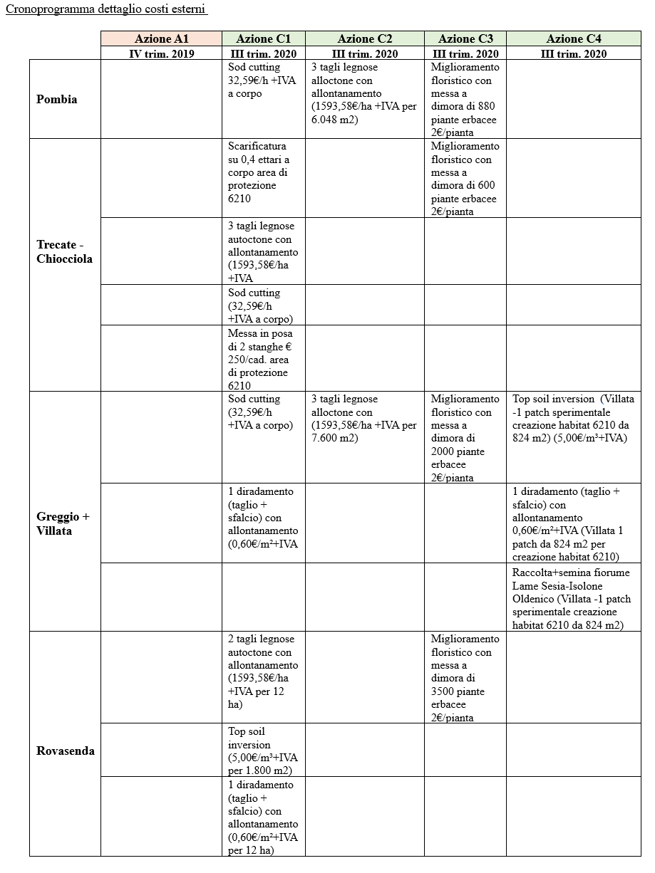 Le azioni C comprendono interventi effettuati da ditte esterne e sono distribuite nelle cinque località individuate nei siti Natura 2000 “Valle Ticino”, “Lame Sesia e Isolone di Oldenico” e “Baraggia di Rovasenda”. Il totale dei costi esterni per le Azioni C ammonta a 198.841 € ripartiti come segue: