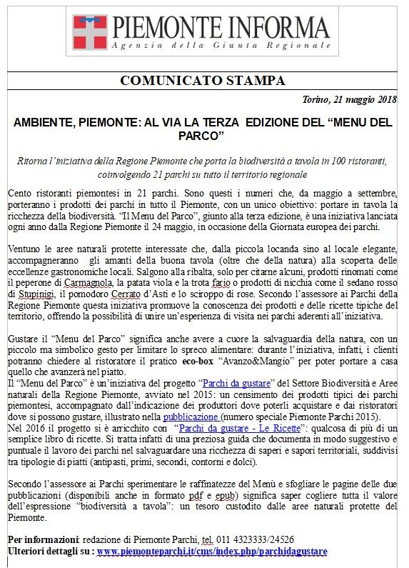 AL VIA LA TERZA EDIZIONE DEL “MENU DEL PARCO”