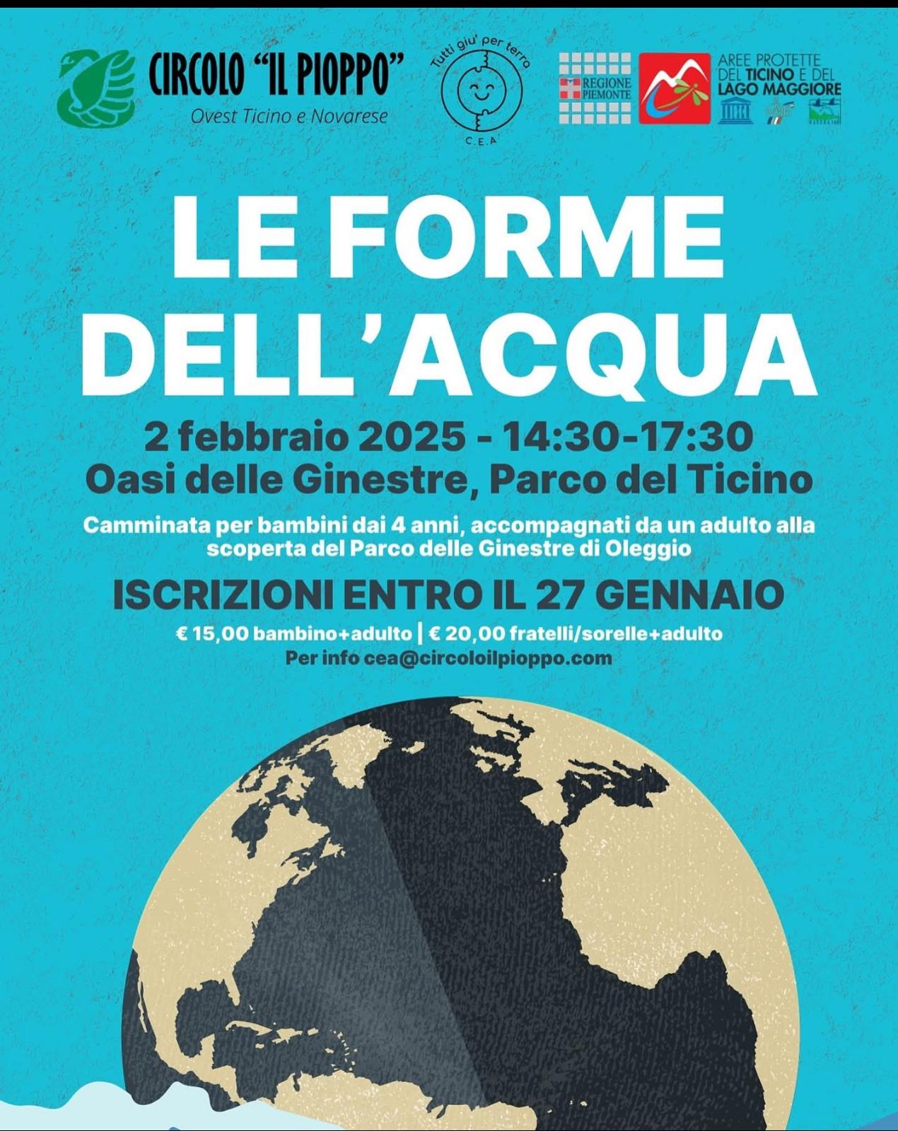 Sabato 1 marzo, dalle 14:30 alle 17:30 all'Oasi delle Ginestre (Parco del Ticino, Oleggio), si terrà "Le forme dell'acqua", una camminata per bambini dai 4 anni, accompagnati da un adulto, alla scoperta dell'Oasi e dei misteri che si celano nell'acqua.