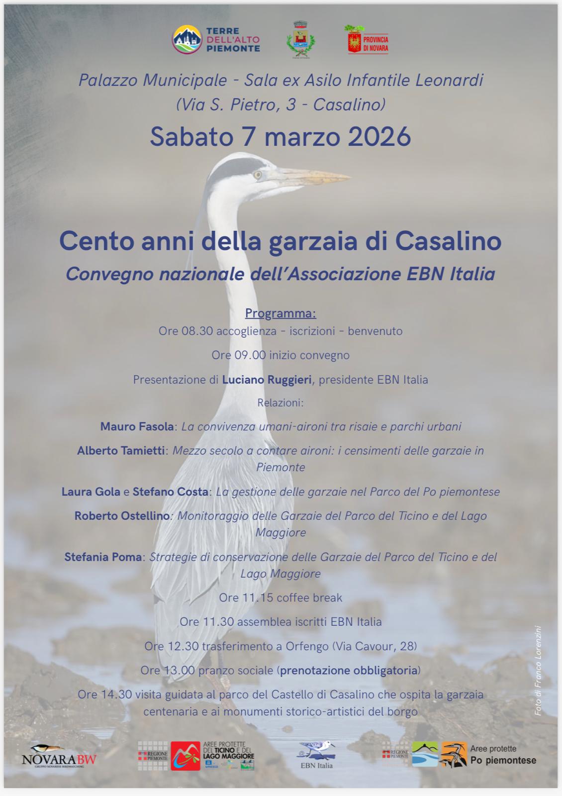 Sabato 7 marzo 2026, dalle ore 8:30 presso il Palazzo Municipale di Casalino, si terrà "Cento anni della Garzaia di Casalino", convegno nazionale dell'Associazione EBN Italia.