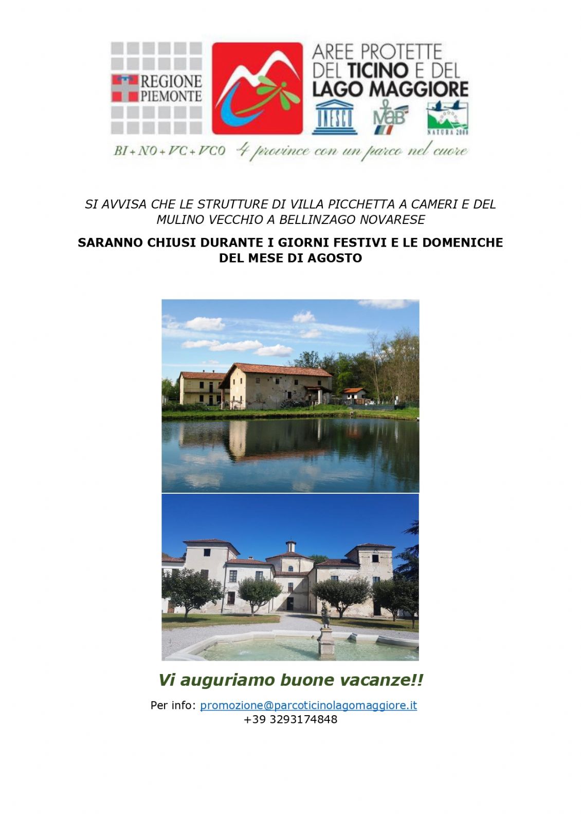 Ricordiamo a tutti i frequentatori del Parco che le strutture rimarranno chiuse a partire da domenica 7 agosto e riapriranno domenica 11 settembre.