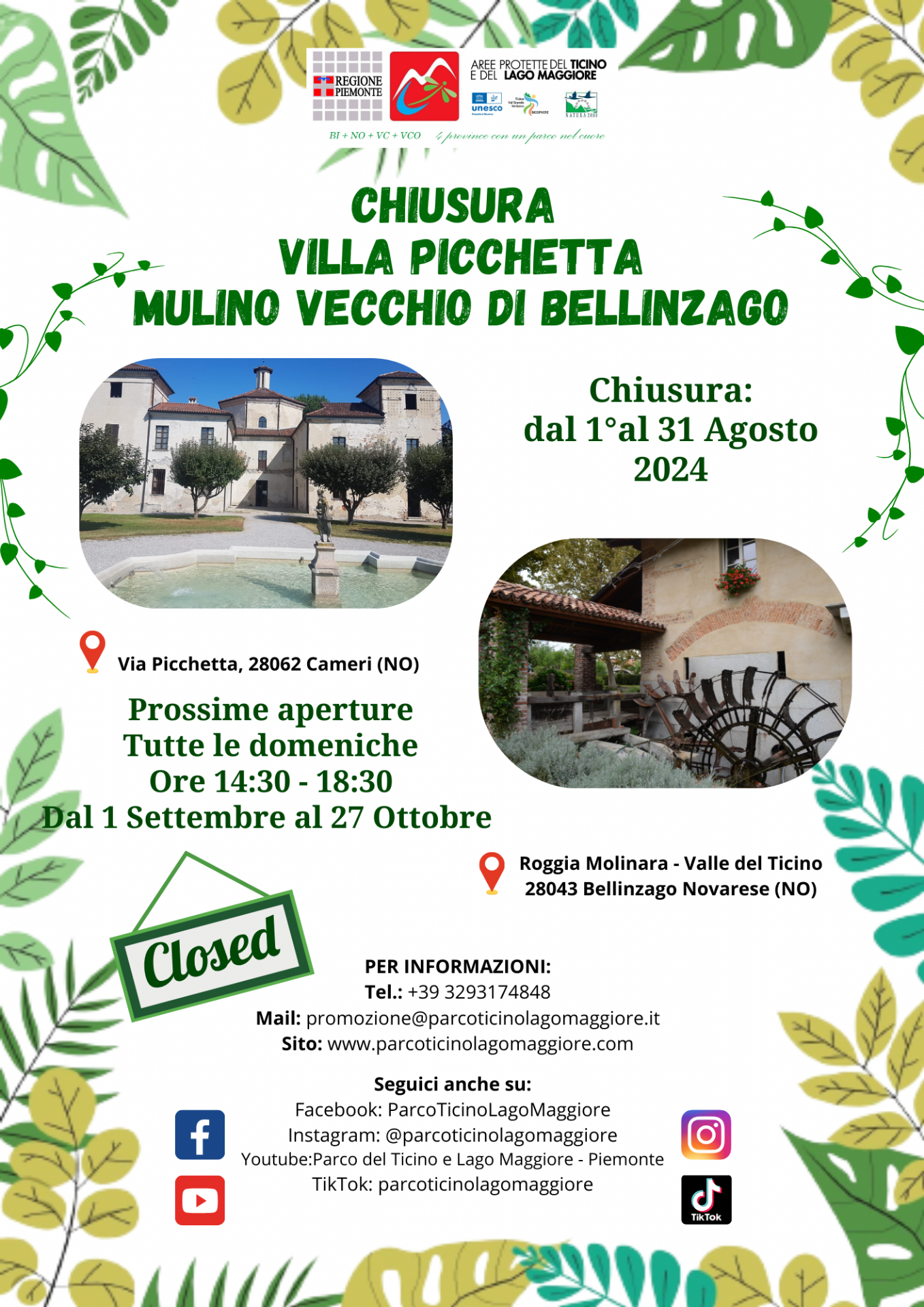 Si avvisa della chiusura di Villa Picchetta (Cameri) e del Mulino Vecchio di Bellinzago N.se per le attività di visita ed eventi per il periodo che andrà dal 1° al 31 di agosto.