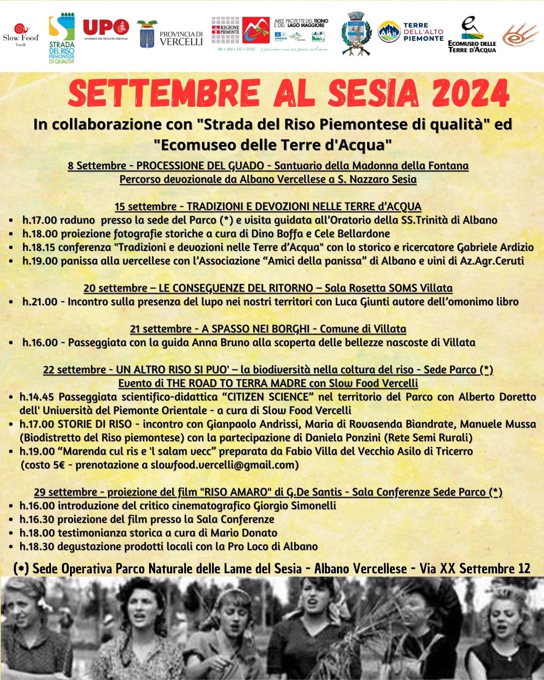 - 22 settembre ore 17:00 Conferenza “Storie di Riso” in collaborazione con “Strada del Riso” e “Ecomuseo delle Terre d’Acqua”.