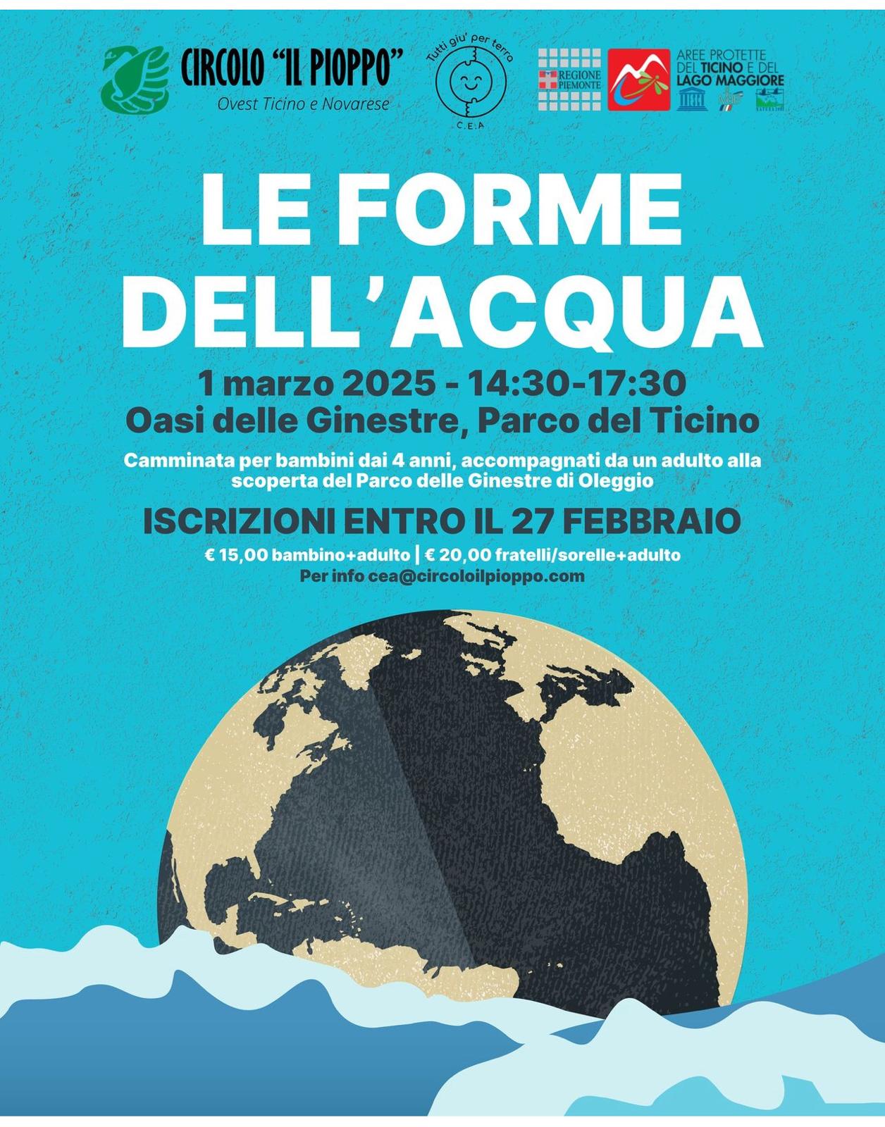 Sabato 1 marzo, dalle 14:30 alle 17:30 all'Oasi delle Ginestre (Parco del Ticino, Oleggio), si terrà "Le forme dell'acqua", una camminata per bambini dai 4 anni, accompagnati da un adulto, alla scoperta dell'Oasi e dei misteri che si celano nell'acqua.