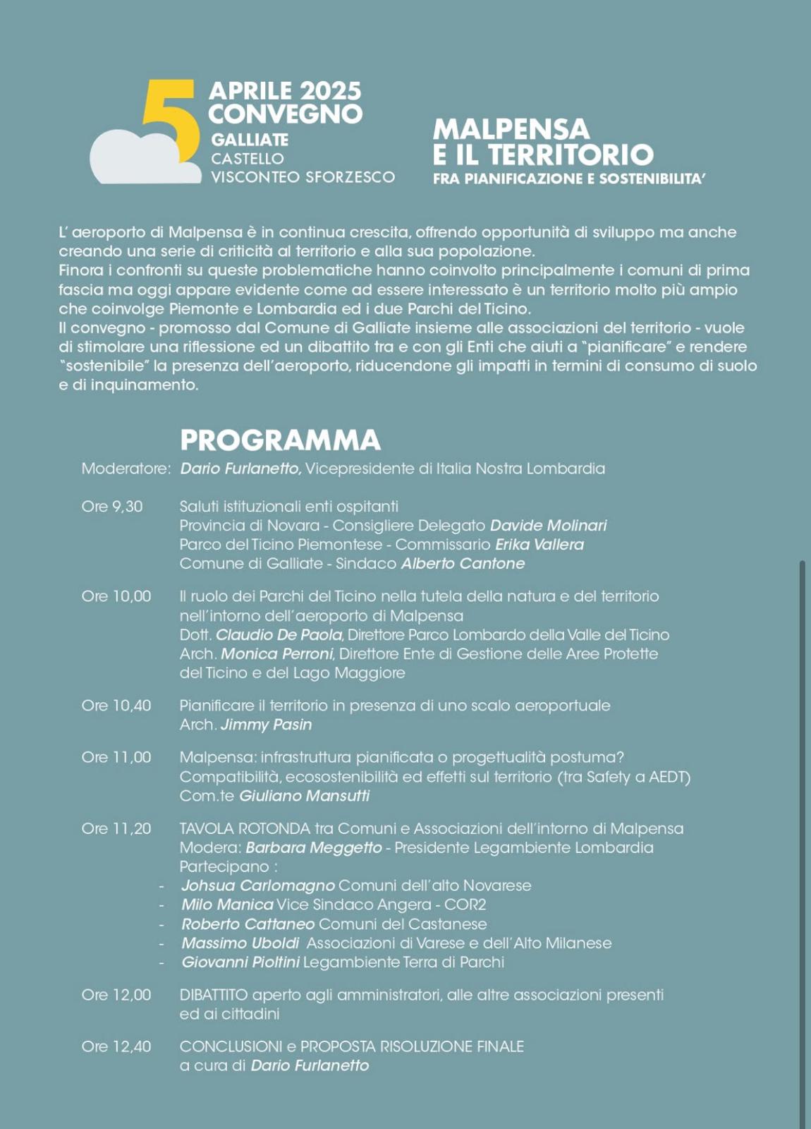 Sabato 5 aprile, presso il Salone Neogotico del Castello di Galliate (NO), si terrà il convegno "Malpensa e il territorio. Fra pianificazione e sostenibilità", promosso dal Comune di Galliate con le associazioni del territorio.