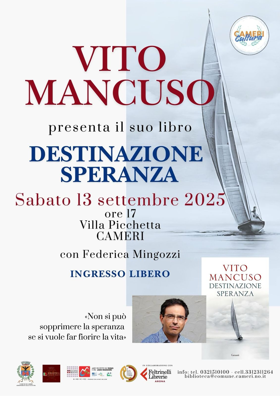 Sabato 13 settembre, alle ore 17 presso Villa Picchetta (Cameri), Vito Mancuso presenterà il suo libro "Destinazione speranza", con Federica Mingozzi.