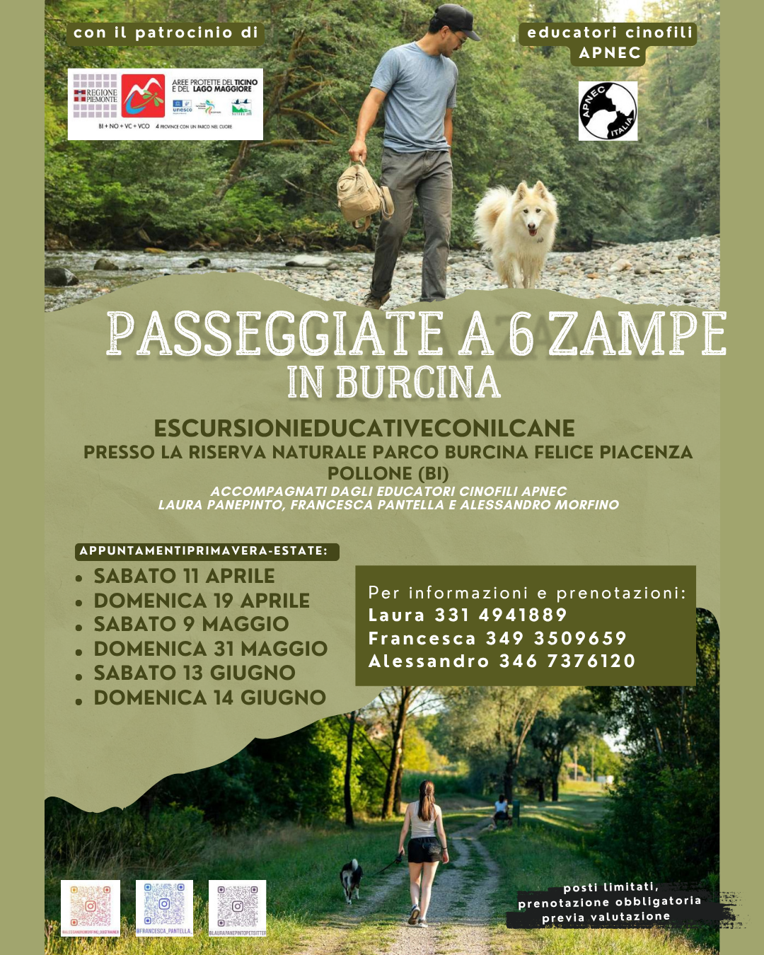 Da sabato 11 aprile presso la Riserva Naturale Parco Burcina Felice Piacenza a Pollone (BI), verranno effettuate delle escursioni educative con i cani con educatori cinofili APNEC.