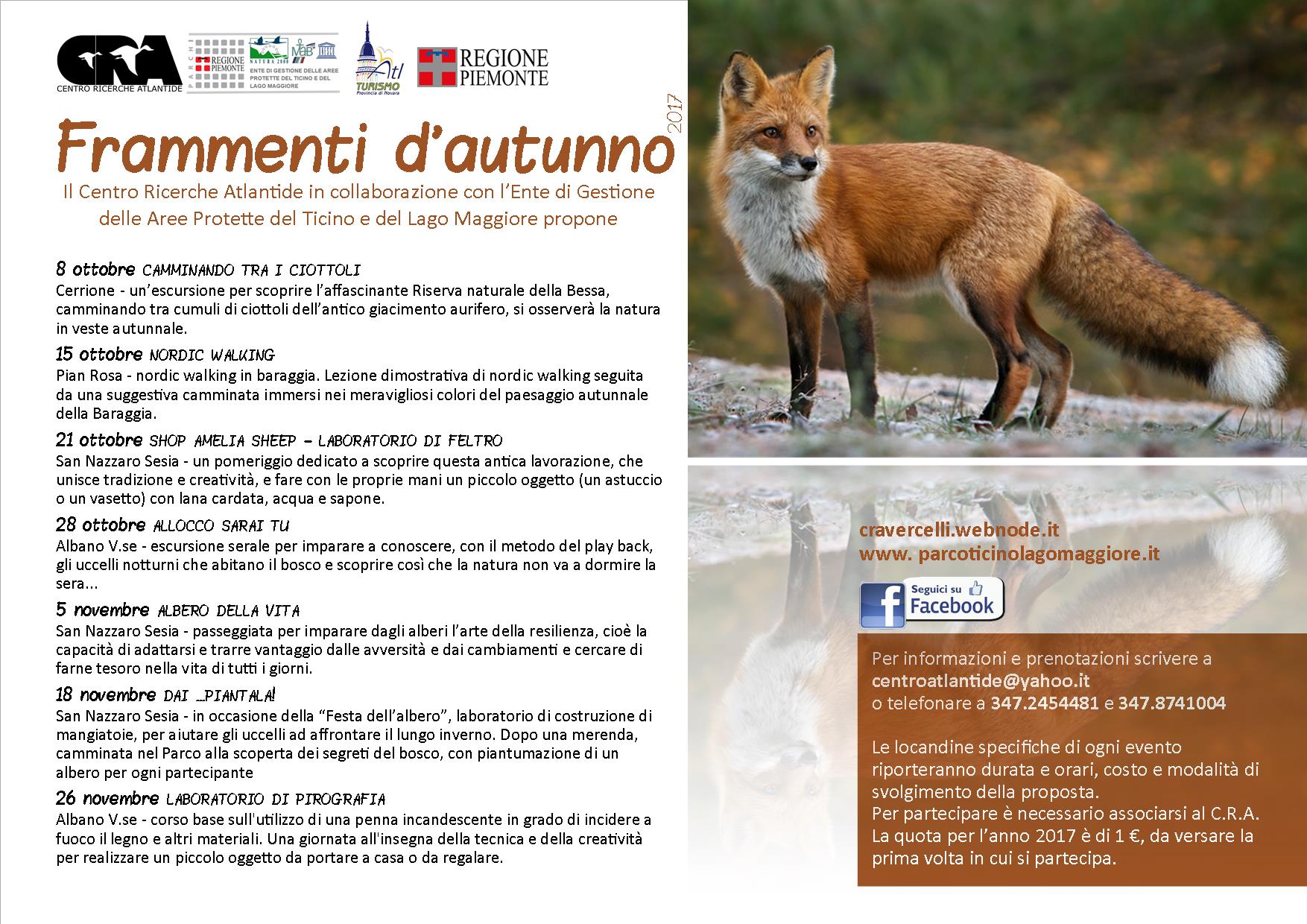Con l’arrivo dell’autunno, il CRA Centro Ricerche Atlantide in collaborazione con l’Ente di Gestione delle Aree Protette del Ticino e del Lago Maggiore, ripropone FRAMMENTI D’AUTUNNO, una serie di iniziative pensate per incuriosire e far avvicinare alla natura adulti, bambini, sportivi e appassionati di laboratori.