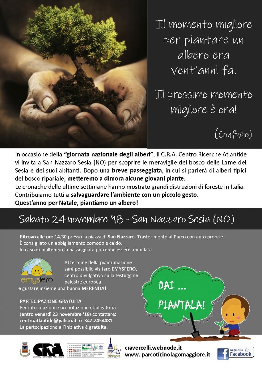 In occasione della "giornata nazionale degli alberi", il C.R.A. Centro Ricerche Atlantide vi invita a San Nazzaro Sesia (NO) per scoprire le meraviglie del bosco delle Lame del Sesia e dei suoi abitanti. Dopo una breve passeggiata in cui si parlerà di alberi tipici del bosco ripariale, metteremo a dimora alcune giovani piante.