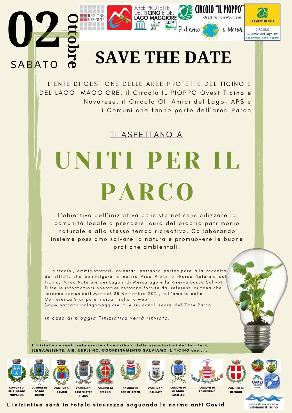 In occasione dell’appuntamento “Puliamo il Mondo” è stata organizzata l'iniziativa "UNITI PER IL PARCO" per Sabato 2 Ottobre 2021. Cittadini, amministratori e volontari potranno partecipare alla raccolta dei rifiuti, che coinvolgerà le nostre Aree Protette (Parco Naturale del Ticino, Parco Naturale dei Lagoni di Mercurago e la Riserva di Bosco Solivo).