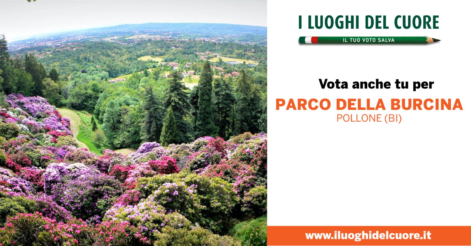 Il grande censimento spontaneo del patrimonio culturale del nostro Paese promosso dal FAI in collaborazione con Intesa Sanpaolo è giunto all’undicesima edizione e la classifica provvisoria de “I Luoghi del Cuore” vede la riserva naturale della Burcina "F. Piacenza" di Pollone (BI) al 191° posto ma la classifica cambia velocemente e chiunque votando e facendo votare può dare il proprio contributo!