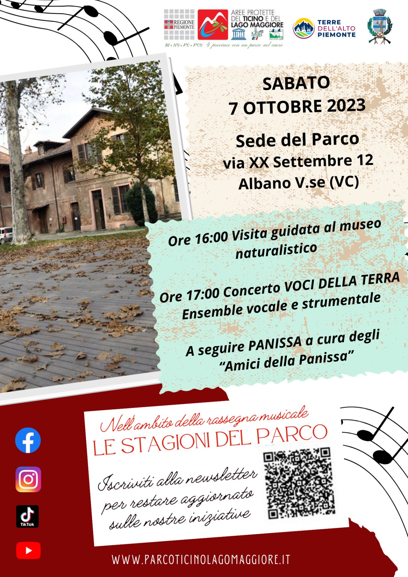 Per la chiusura della rassegna, che si terrà nella cornice della Tenuta Economia di Albano Vercellese oggi sede operativa dell'ente di gestione ma in passato antico cascinale proprietà degli Arborio di Gattinara già dal XIV secolo, l'ente propone un ricco programma. A partire dalle ore 16:00 è infatti prevista una visita guidata gratuita al museo naturalistico di Albano V.se, alle ore 17:00 il concerto e a seguire distribuzione della panissa a cura degli “Amici della Panissa”.
