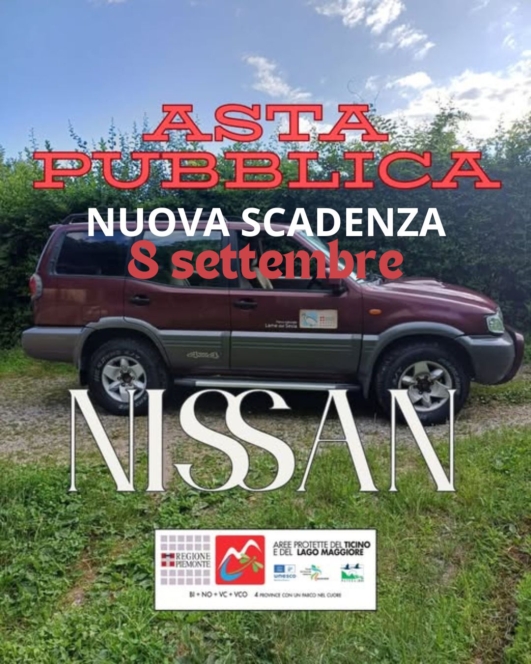 L'Ente di Gestione delle Aree Protette del Ticino e del Lago Maggiore intende procedere alla vendita mediante asta pubblica di n. 1 autoveicolo di proprietà non più utilizzato per fini istituzionali da questa Amministrazione.