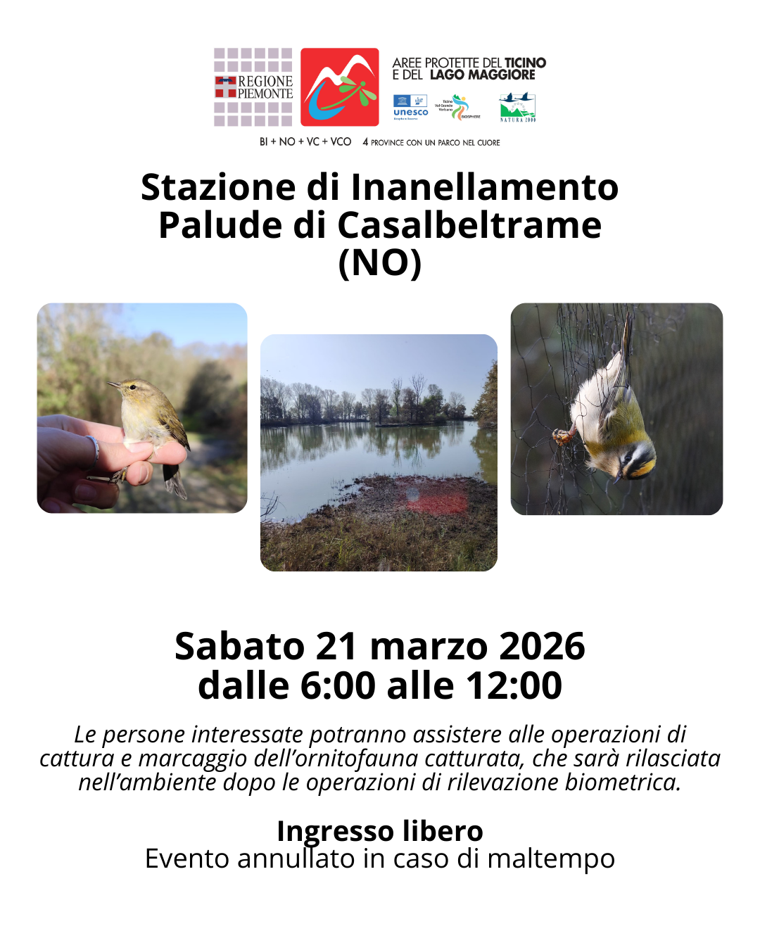 Sabato 21 marzo 2026, dalle ore 6 alle ore 12 sarà aperta la stazione di inanellamento alla palude di Casalbeltrame.