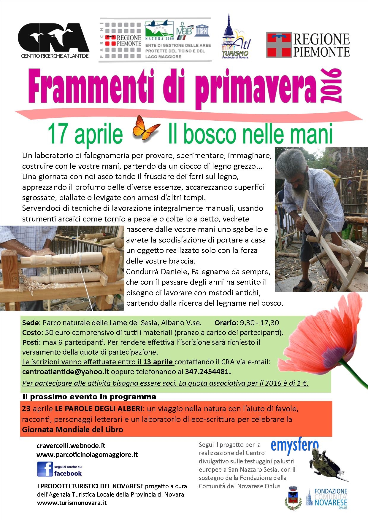 - 2) IL BOSCO NELLE MANI Domenica 17 aprile la proposta è “Il bosco nelle mani”, un laboratorio di falegnameria che si svolgerà al Parco delle Lame del Sesia ad Albano V.seLa proposta è di una giornata passata ad ascoltare il frusciare dei ferri sul legno, apprezzando il profumo delle diverse essenze, accarezzando superfici sgrossate, piallate o levigate con arnesi d'altri tempi.