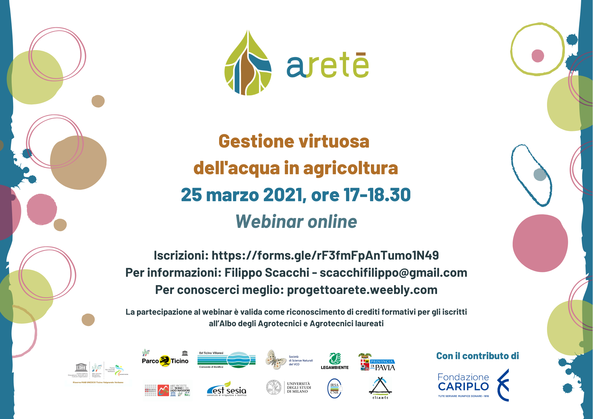 prossimamente il Webinar "Gestione virtuosa dell'acqua in agricoltura". Si terrà giovedì 25 marzo dalle 17 alle 18.30, all'interno del progetto Aretè. Per partecipare è necessario iscriversi attraverso il link indicato!