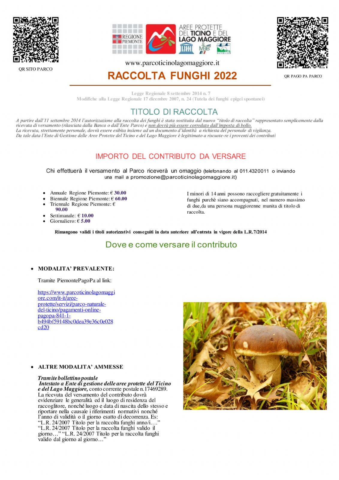 ⚠️ Da alcuni anni l’autorizzazione alla raccolta dei funghi è stata sostituita dal nuovo “titolo di abilitazione alla raccolta” che potete ottenere anche mediante il versamento del contributo a favore degli enti parco regionali.