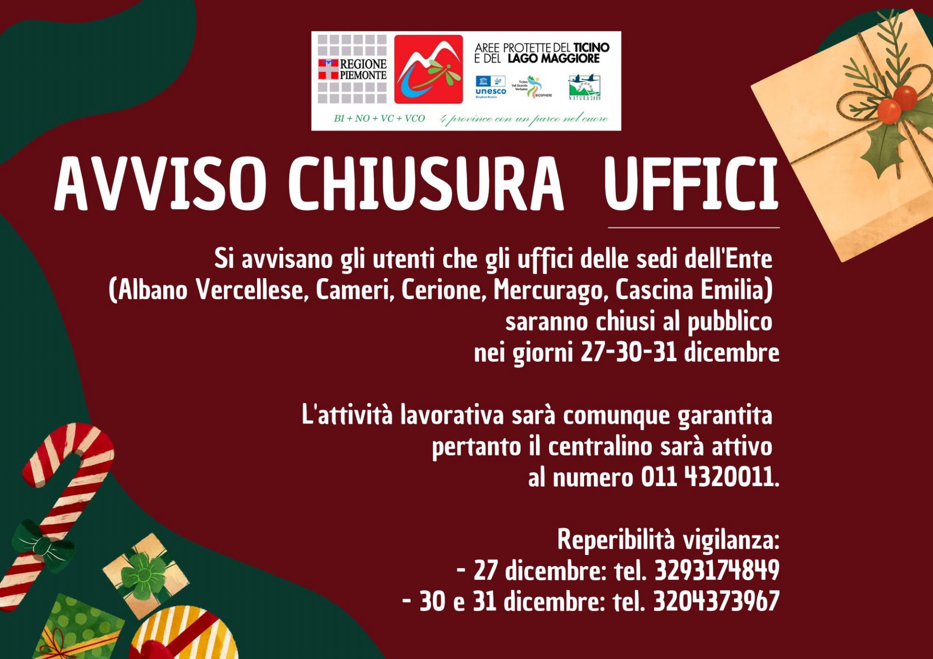 Si avvisano gli utenti che gli uffici delle sedi dell'Ente (Albano Vercellese, Cameri, Cerione, Mercurago, Cascina Emilia) saranno chiusi al pubblico nei giorni 27-30-31 dicembre.