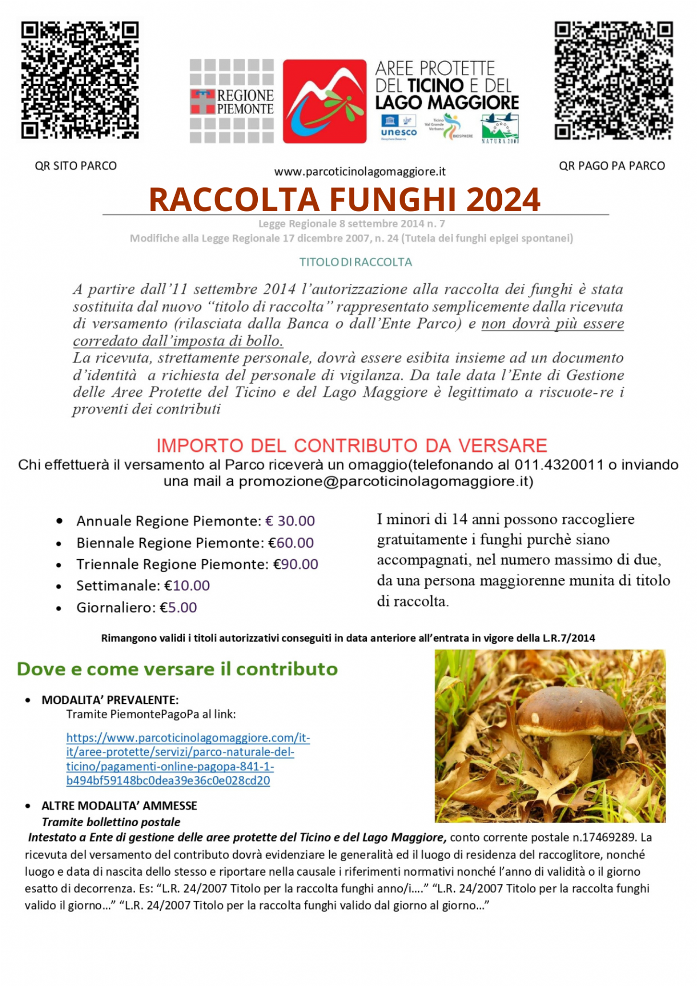 Intestato a Ente di gestione delle aree protette del Ticino e del Lago Maggiore, conto corrente postale n.17469289. La ricevuta del versamento del contributo dovrà evidenziare le generalità ed il luogo di residenza del raccoglitore, nonché luogo e data di nascita dello stesso e riportare nella causale i riferimenti normativi nonché l'anno di validità o il giorno esatto di decorrenza.
