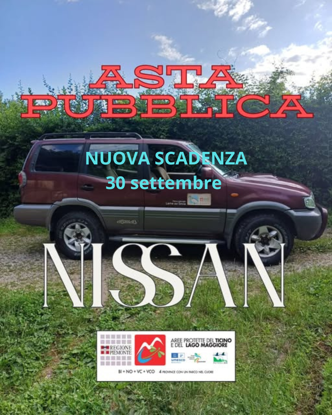 L'Ente di Gestione delle Aree Protette del Ticino e del Lago Maggiore intende procedere alla vendita mediante asta pubblica di n. 1 autoveicolo di proprietà non più utilizzato per fini istituzionali da questa Amministrazione.