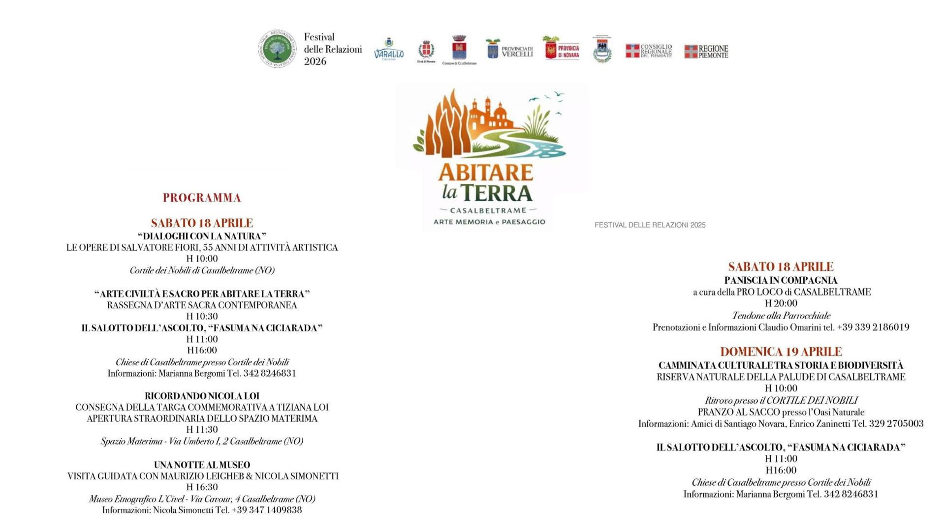 Il Festival delle Relazioni torna a Casalbeltrame con l'evento Abitare la terra, arte memoria e paesaggio. L’edizione 2025‑2026 propone un percorso di incontri, mostre e camminate culturali che intrecciano memoria, paesaggio e spiritualità, valorizzando il territorio e le sue relazioni umane e ambientali. Il programma completo degli eventi di sabato 18 e domenica 19, oltre che i i contatti sono riportati nella locandina.