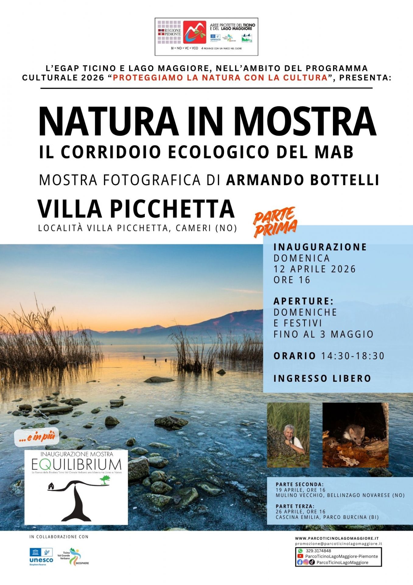 Domenica 12 aprile 2026 alle ore 16 presso la sede di Villa Picchetta apriremo il programma culturale dell'Ente con l'inaugurazione di due esposizioni (una fotografica, l'altra composta da installazioni) dedicate alla Riserva MAB della Biosfera Ticino Val Grande Verbano e all'importanza del rapporto uomo-ambiente.