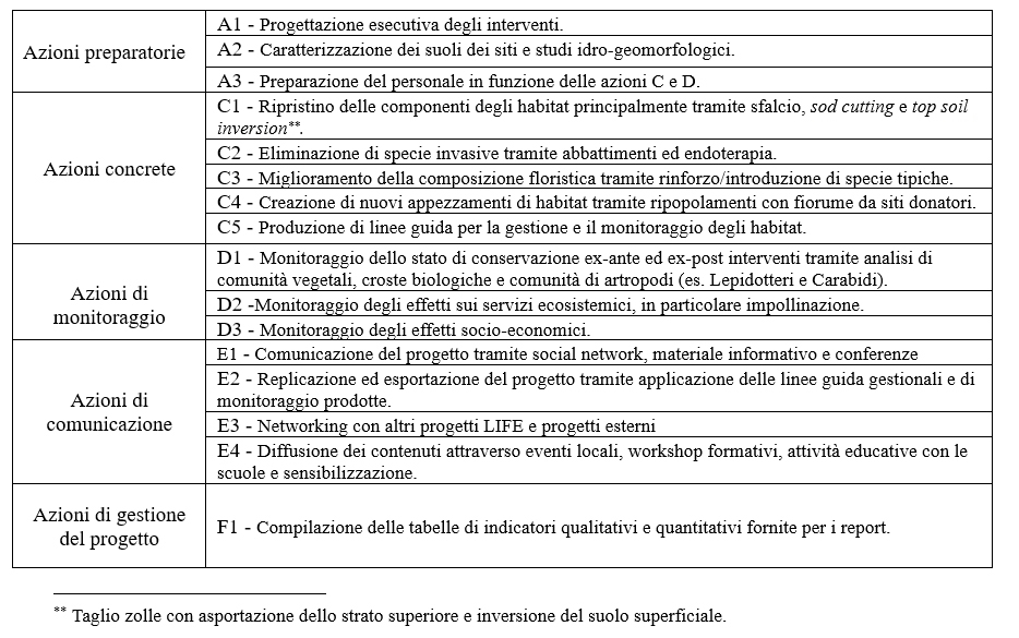 Gli obiettivi comprendono il ripristino delle componenti degli habitat target, riduzione e controllo delle specie arboree invasive, il miglioramento della componente floristica e la creazione di nuovi appezzamenti di habitat, produzione e esportazione di linee guida per gestione e monitoraggio degli habitat e promozione e diffusione dei risultati del progetto tra grande pubblico e portatori di interesse.