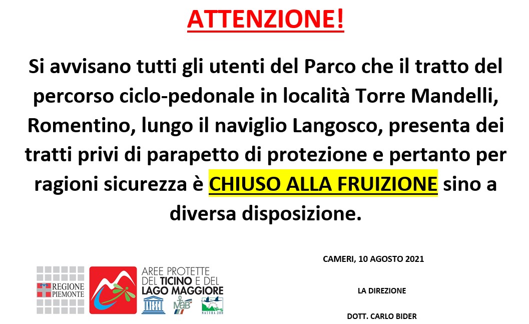 ATTENZIONE! Si avvisano tutti gli utenti del Parco che il tratto del percorso ciclo-pedonale in località Torre Mandelli, Romentino, lungo il naviglio Langosco, presenta dei tratti privi di parapetto di protezione e pertanto per ragioni sicurezza è CHIUSO ALLA FRUIZIONE sino a diversa disposizione.