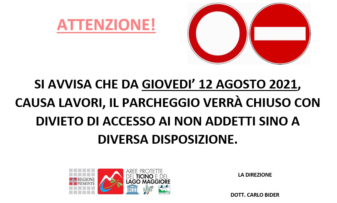Si avvisa che da Giovedì 12 agosto 2021, causa lavori, il parcheggio riservato agli utenti in località Cascina Picchetta di Cameri (NO), verrà chiuso con divieto di accesso ai non addetti sino a diversa disposizione.