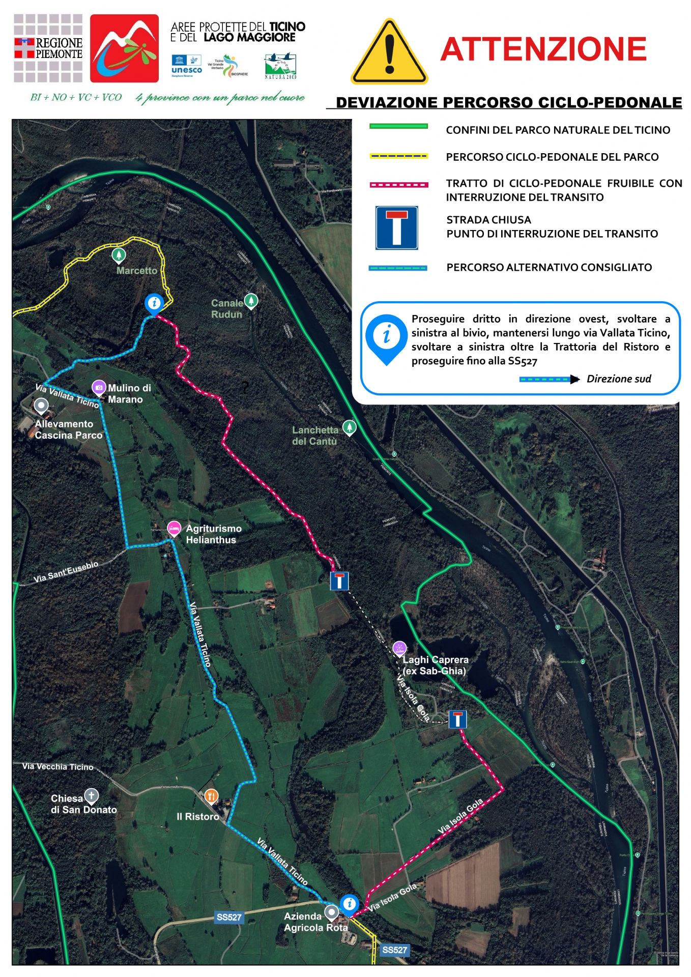 Nei prossimi giorni verrà posizionata opportuna cartellonistica al fine di consentire un percorso alternativo a quello interessato dalla recente sentenza del TAR Piemonte avente ad oggetto 900 metri nel Comune di Oleggio in località ex Sab-Ghia del più ampio percorso ciclopedonale. Ciò garantirà il collegamento con l'intera rete, di circa 63 chilometri, della Valle del Ticino e la fruibilità del percorso nelle more della definitività della vicenda.