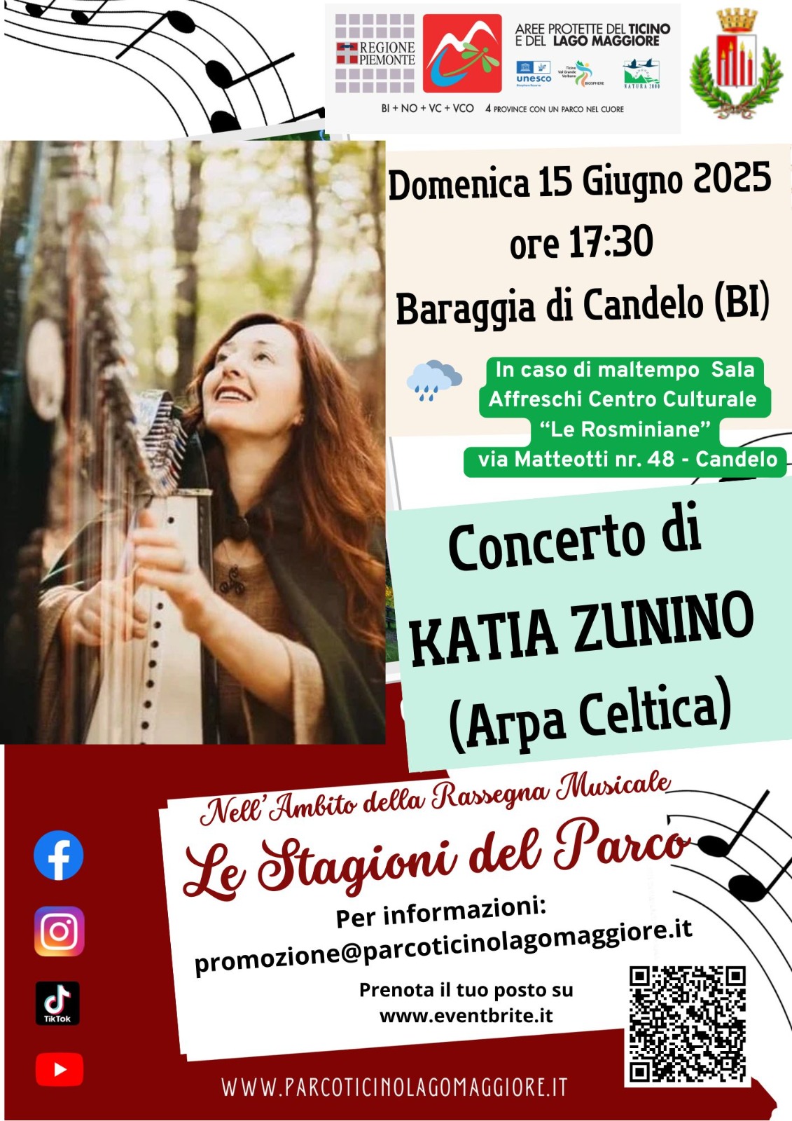 La rassegna musicale “Le stagioni del Parco” del 2025, musica d’insieme nelle aree naturali protette, si avvia con il concerto di Katia Zunino (arpa celtica) "Vie" nella splendida cornice della Baraggia di Candelo, domenica 15 giugno alle ore 17:30.
