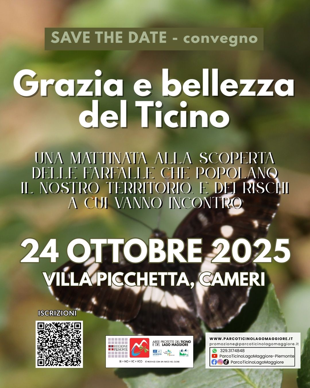Venerdì 24 ottobre, dalle ore 9,30 a Villa Picchetta (Cameri, NO), si terrà il convegno "Grazia e bellezza del Ticino", dedicato alle farfalle che popolano il nostro territorio.