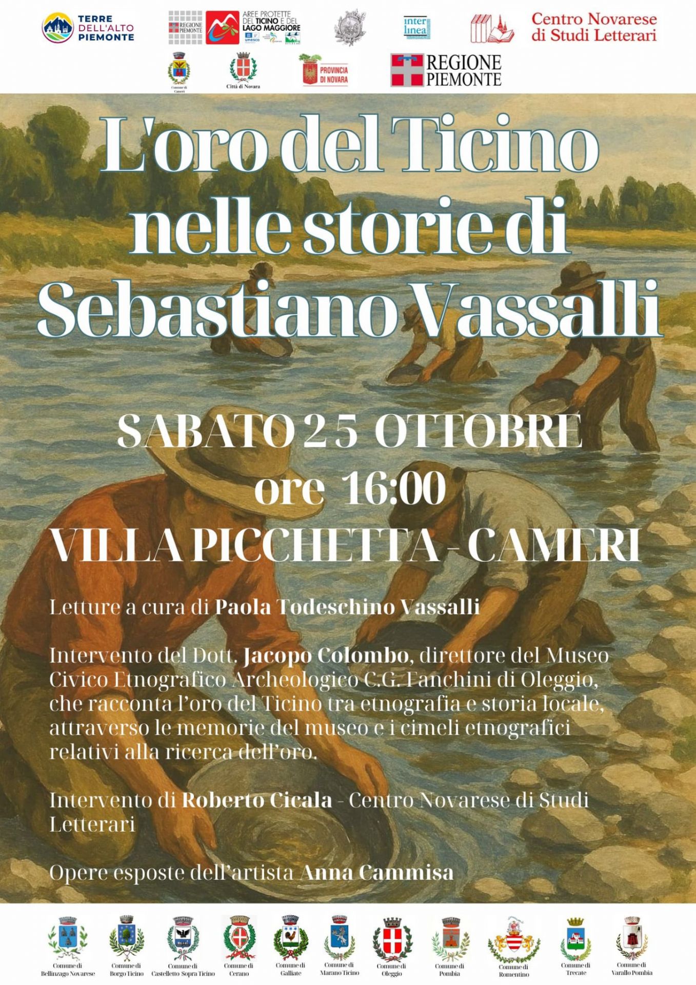 Sabato 25 ottobre alle ore 16:00 presso Villa Picchetta a Cameri (NO), si terrà l'evento "L'oro del Ticino - storie di Sebastiano Vassalli", con letture a cura di Paola Todeschino Vassalli e interventi del Dott. Jacopo Colombo , direttore del Museo Civico Etnologico Archeologico C.G. Fanchini di Oleggio, che racconterà l'oro del Ticino tra etnografia e storia locale, attraverso le memorie del museo e i cimeli etnografici relativi alla ricerca dell'oro e di Roberto Cicala del Centro Novarese di Studi Letterari.