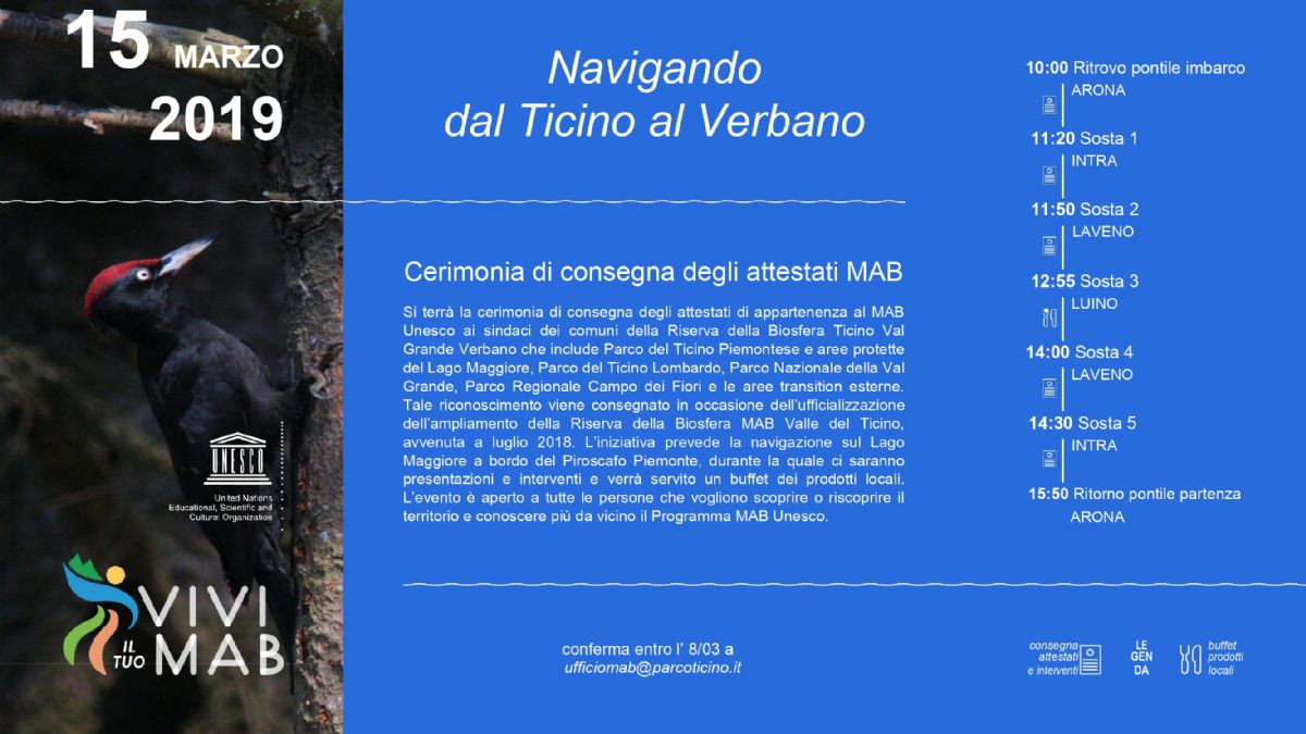 A seguito dell’avvenuto riconoscimento UNESCO della Riserva MAB (Man & Biosphere) “Ticino Val Grande Verbano”, avvenuta nel corso della 30esima Sessione del Consiglio Internazionale di coordinamento del Programma MAB che si è svolto dal 23 al 27 luglio 2018 in Indonesia, siamo lieti di invitare le SS.LL. a presenziare alla Cerimonia che si terrà sul piroscafo Piemonte in navigazione sul Lago Maggiore, secondo l’itinerario indicato nell’ invito allegato, che vuole rappresentare il percorso di ampliamento che la Riserva “Valle del Ticino” ha intrapreso sino ad addivenire alla Riserva “Ticino Val Grande Verbano”.
