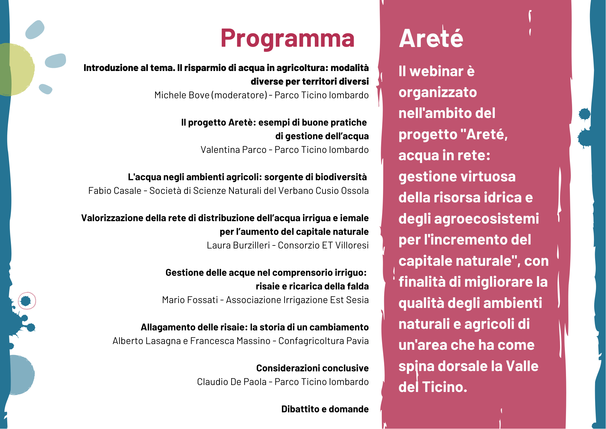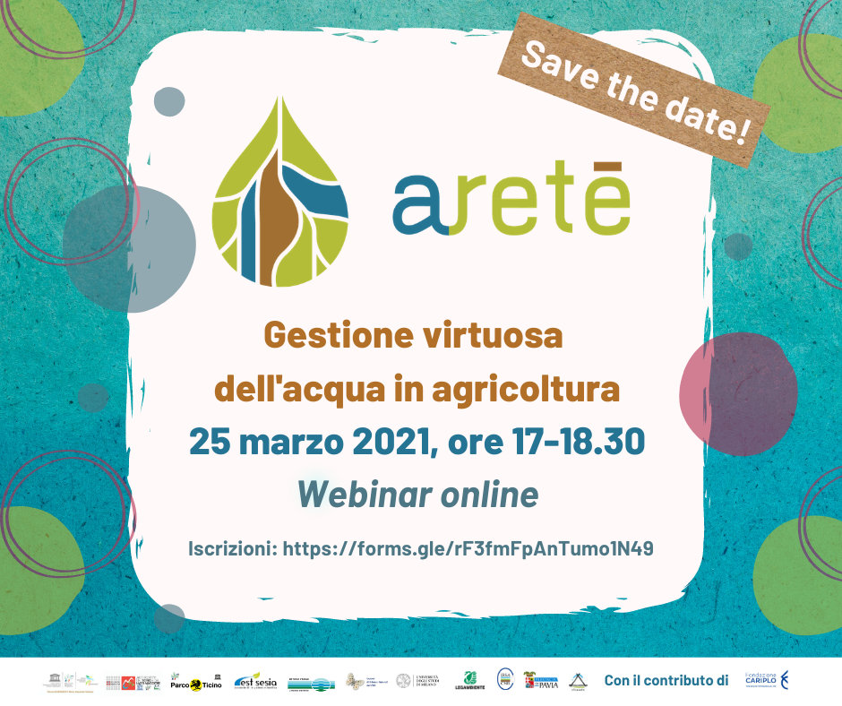prossimamente il Webinar "Gestione virtuosa dell'acqua in agricoltura". Si terrà giovedì 25 marzo dalle 17 alle 18.30, all'interno del progetto Aretè. Per partecipare è necessario iscriversi attraverso il link indicato!