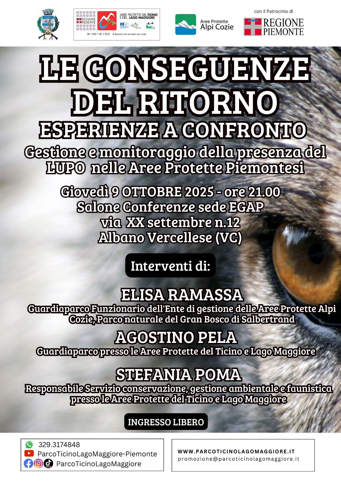 L’EGAP Ticino e Lago Maggiore, nell’ambito della rassegna SETTEMBRE AL SESIA 2025, organizza una serata informativa presso la sala conferenze della sede di Albano Vercellese il prossimo giovedì 9 ottobre 2025 alle ore 21:00, titolo: “IL LUPO – Le conseguenze del ritorno – esperienze a confronto”.