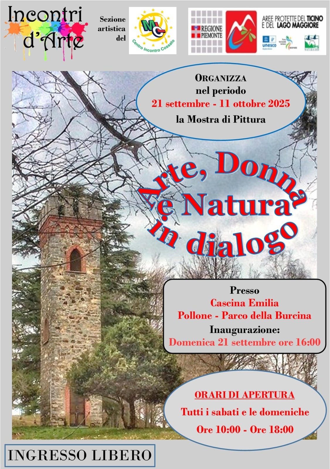 Appuntamento a Cascina Emilia, alle ore 16 di domenica 21 settembre, per l'inaugurazione della mostra "Arte, donna e natura in dialogo" dell'associazione Centro Incontro Cossato.