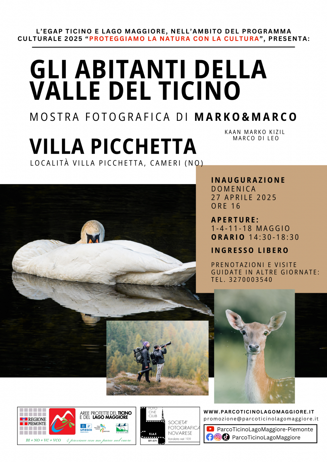 Domenica 27 aprile, alle ore 16 a Villa Picchetta (Cameri), è stata inaugurata la mostra fotografica "Gli abitanti della Valle del Ticino" dei fotografi naturalisti Kaan Marko Kizil e Marco Di Leo, frutto di un lungo percorso di osservazione attraverso appostamenti pazienti e lunghi trekking immersi nella natura, seguendo il ritmo delle stagioni e rispettando i tempi degli animali.
