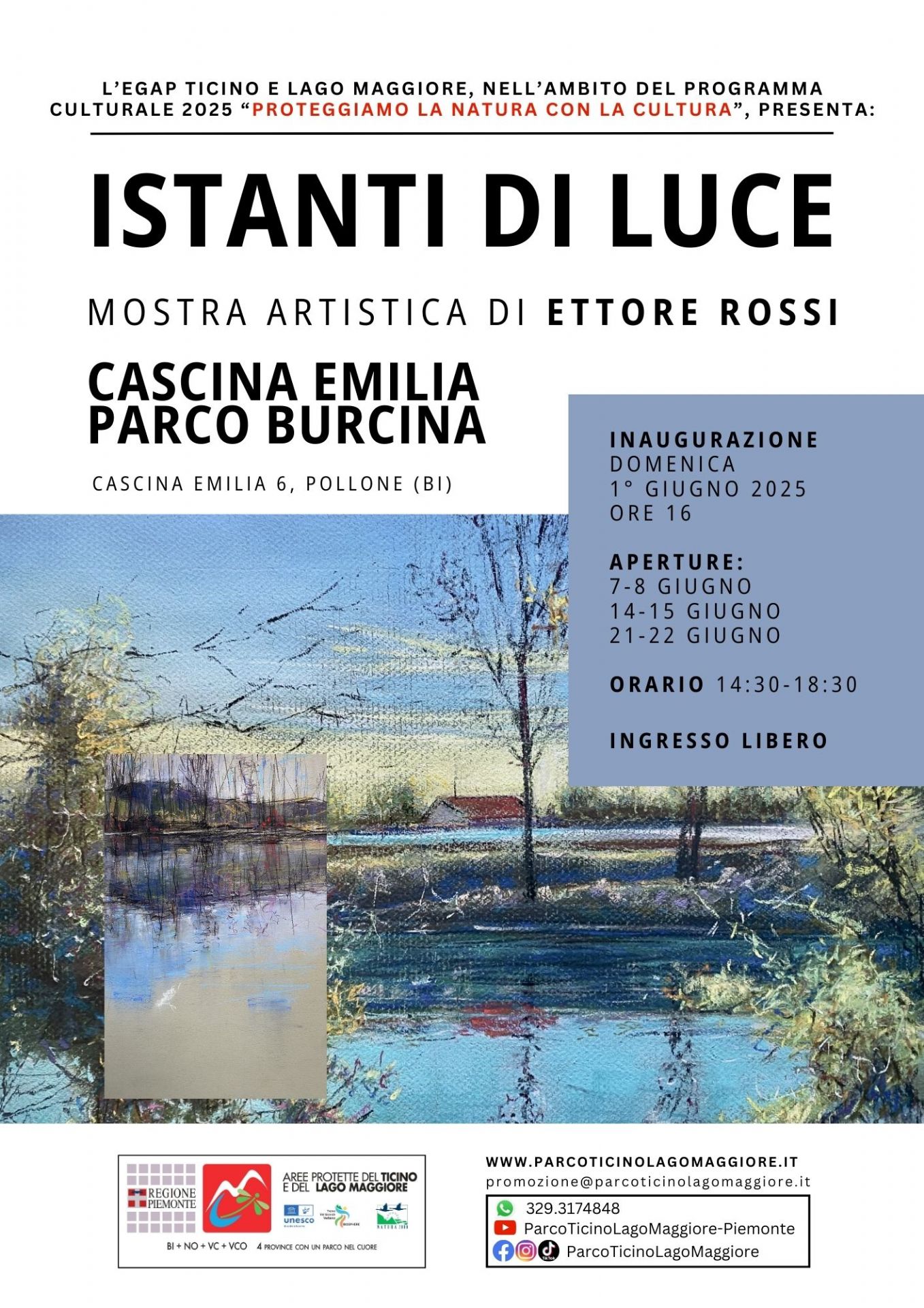 “Istanti di luce”, mostra artistica di Ettore Rossi, presso Cascina Emilia (via Cascina Emilia 6, Pollone, BI), nella Riserva Naturale Parco Burcina, sarà visitabile ancora nelle giornate di sabato e domenica 21-22 giugno, dalle ore 14:30 alle ore 18:30.