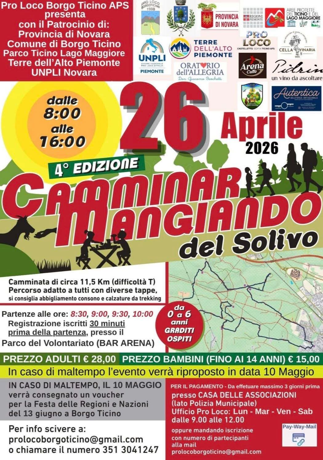 La quarta edizione di "Camminar mangiando del Solivo", organizzata dalla Pro Loco di Borgo Ticino con il patrocinio dell'Ente, si terrà domenica 26 aprile.