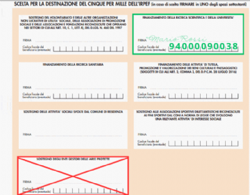 Per donare agli enti di gestione delle aree protette regionali, occorre firmare il riquadro contrassegnato dall’indicazione “Finanziamento della ricerca scientifica e dell’università” (in quanto il riquadro “Sostegno degli enti delle aree protette” è riservato ad enti nazionali) e inserire il codice fiscale dell’Ente (94000090038), all’interno del proprio modello di dichiarazione nella sezione: “Scelta per la destinazione del cinque per mille dell’IRPEF”, come nell’immagine d’esempio.