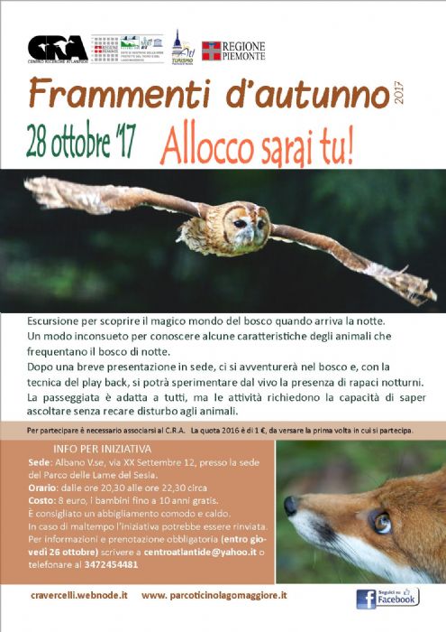 Sabato 28 ottobre, verrà proposta una serata diversa, “Allocco sarai tu” infatti vedrà le guide del CRA accompagnare i partecipanti in una suggestiva passeggiata notturna alla scoperta delle ricca vita del bosco.