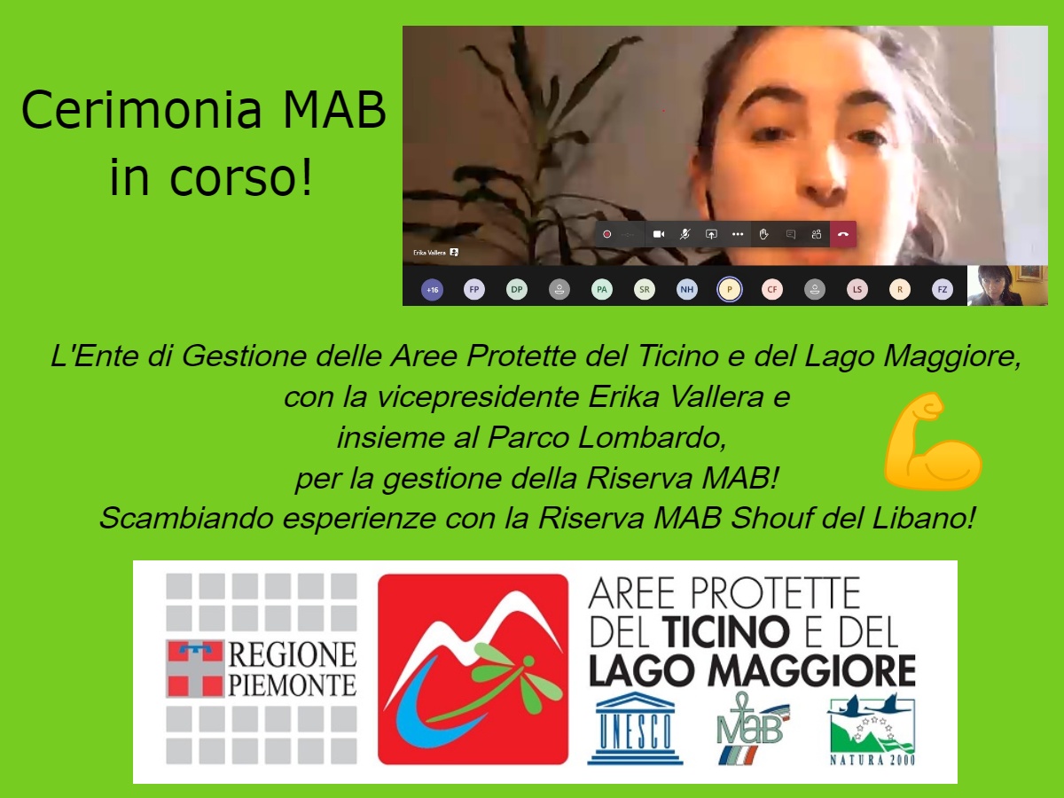 L'Ente di Gestione delle Aree Protette del Ticino e del Lago Maggiore, con la vicepresidente Erika Vallera ed il Parco Lombardo del Ticino, stanno partecipando alla Cerimonia MAB! Oggi infatti facciamo gli auguri a tutti i papà ma è anche la giornata mondiale per l'azione per il clima quindi questa cerimonia si colloca perfettamente in questa giornata importante: si stanno scambiando esperienze con altre riserve, come la Riserva MAB Shouf del Libano, per imparare e condividere idee e nozioni sulla gestione delle, Fondamentali, riserve della Biosfera!