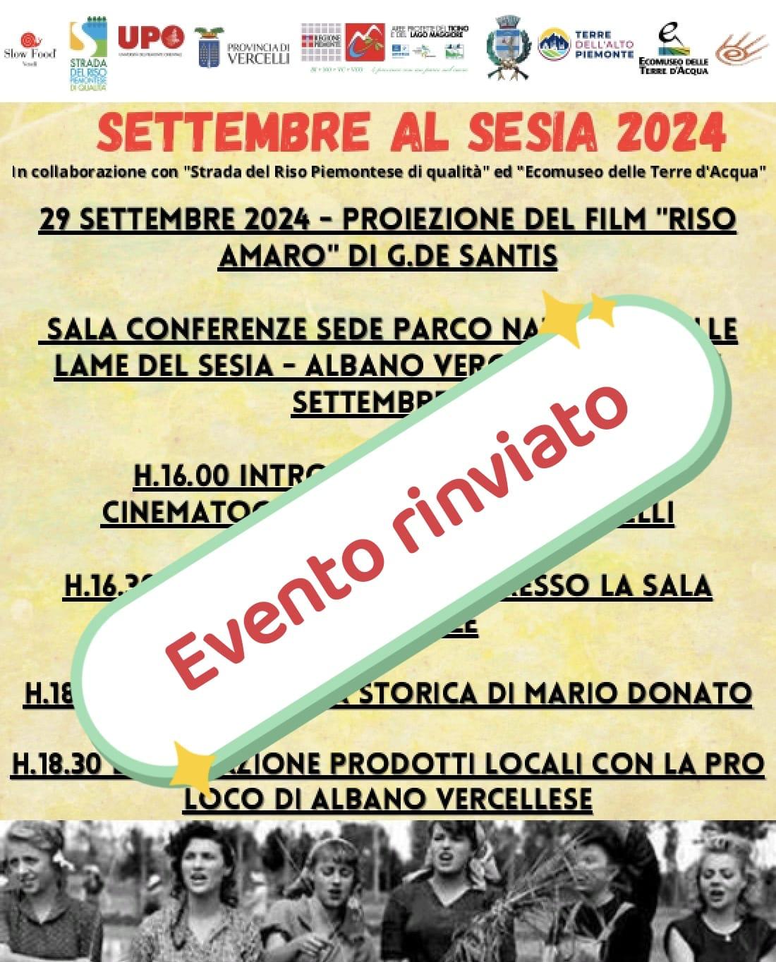 Si avvisa che a causa di problematiche tecniche l'evento di domani è ad Albano Vercellese è annullato e rinviato a data da destinarsi