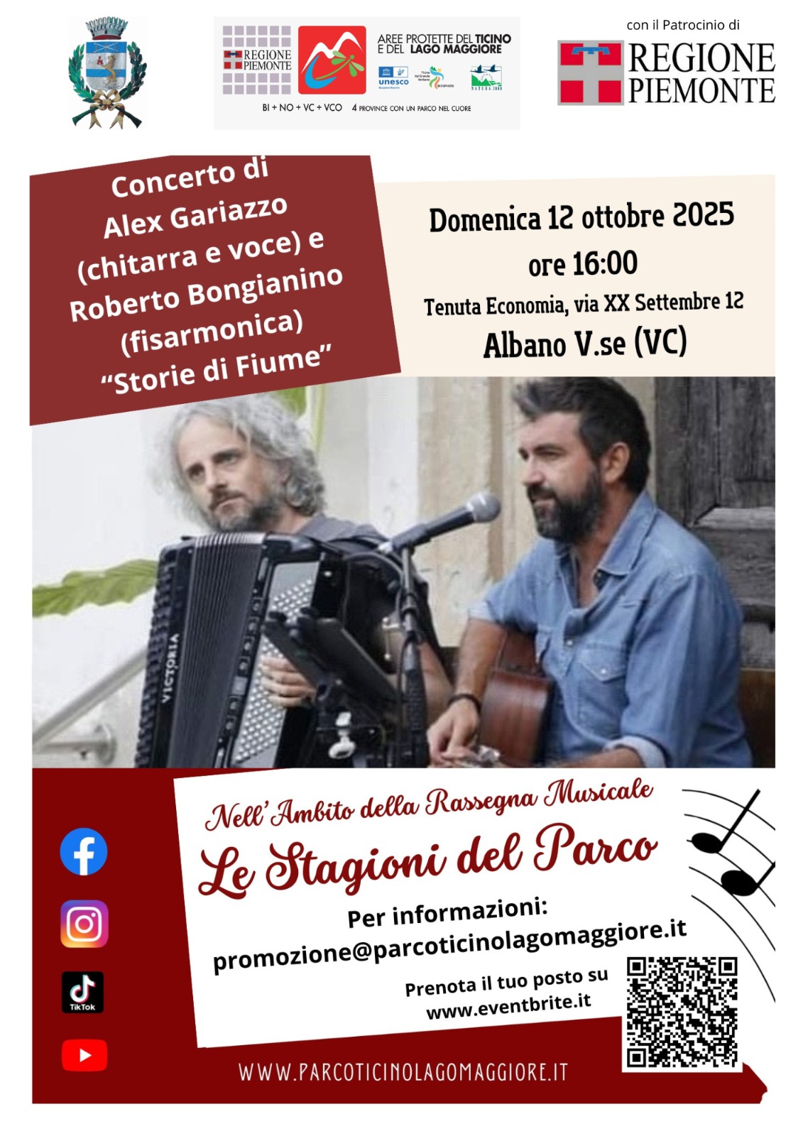 L’EGAP Ticino e Lago Maggiore, nell’ambito della Rassegna Musicale “Le Stagioni del Parco”, organizza presso la propria sede di Tenuta Economia ad Albano Vercellese un concerto che vedrà protagonista un eclettico duo guidato da Alex Gariazzo, da 30 anni chitarrista e cantante della Treves Blues Band, oltre che produttore,compositore e richiesto session man per numerosi artisti internazionali (Hamish Stuart, Lou Marini, Michael McDermott, Chris Jagger, Scarlet Rivera) in compagnia delll’eccellente polistrumentista Roberto Bongianino (Paolo Bonfanti Band, Animalunga, Band’Abord) alla fisarmonica, accordina, mandolino e cori.